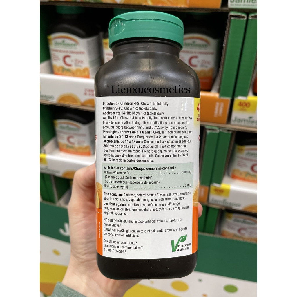 Viên nén nhai Vitamin C &Zinc 500mg Jamieson 400 viên; hsd 2025