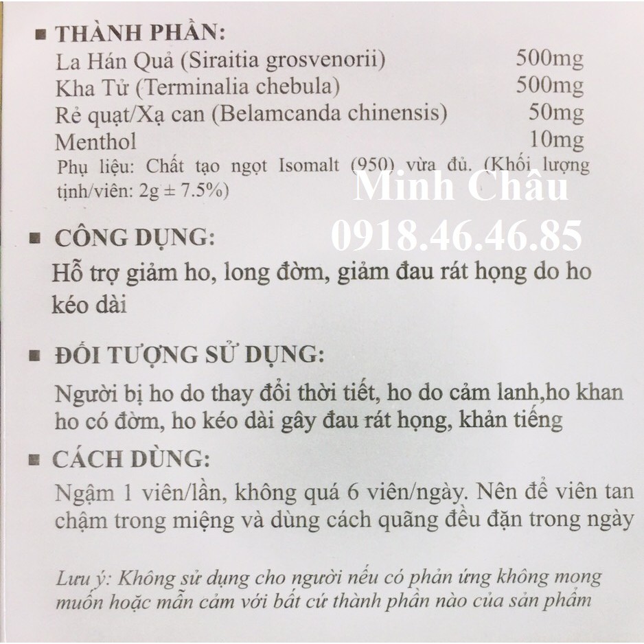 Công dụng: Giảm ho, long đờm, giảm đau rát họng do ho kéo dài. Dùng cho người bị ho do thay đổi thời tiết, ho do cảm lạnh, ho khan, ho có đờm, ho kéo dài do viêm họng, khàn tiếng. Ngậm 1 viên 1 lần ngày 6 viên Quy cách: Hộp 60 viên Xuất xứ: Việt Nam Sản xuất: Công ty