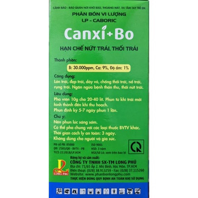Thành Phần: -B: 30.000ppm, Ca9%, Độ Ẩm: 1% Công Dụng: - Lớn Trái, Đẹp Trái, Dày Vỏ, Chống Thối Trái, Nổ Trái, Rụng Trái. Ngăn Ngừa bệnh Thán Thư, Thối Nứt Trái. Quyên Dùng: - Pha Viên 10g Cho 20-40 Lít. Phun Từ Khi Trái Mới Hình Thành Đến Khi Thu Hoặch. - Phun Định Kì 5-7 Ngày Phun 1 Lần. Lưu Ý: - Nên phun lúc sáng sớm. - Có Thể Pha Chung Vơi Các Loại Thuốc BVTV Khác. - Thời Gian Cách Ly An Toàn: 3 Ngày - Không Dùng Cho Người Và Gia Súc. #phanbonviluongcanxi+bo