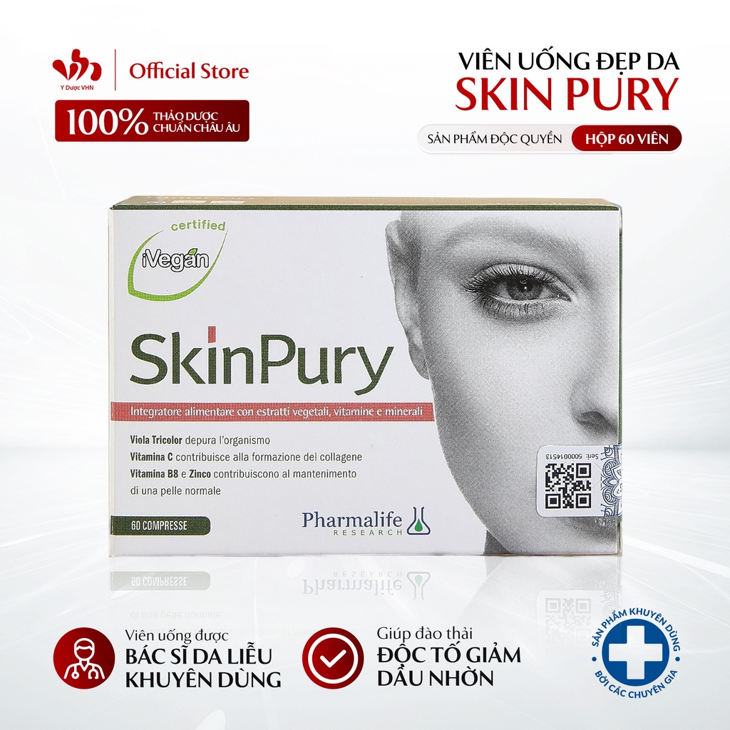 Viên Uống Đẹp Da Skin Pury PHARMALIFE RESEARCH Hỗ Trợ Thải Độc, Ngăn Ngừa Lão Hóa 60 Viên/Hộp THÔNG TIN SẢN PHẨM - Tên sản phẩm: Viên Uống Đẹp Da Skin Pury - Thương hiệu: PHARMALIFE RESEARCH - Xuất xứ: Ý - Trọng lượng: Hộp 60 viên - Hạn sử dụng: 36 tháng kể từ ngày sản xuất. THÀNH PHẦN - Chiết suất hạt nho, L –Methionine, vitamin E, vitamin C, Selen, Zn, B8, chiết xuất cọ lùn, vitamin B3, Zn, Selen. CÔNG DỤNG - Bổ sung các axit amin, vitamin và khoáng chất giúp tăng cường sức đề kháng và dưỡng ẩm cho da. - Hỗ trợ chống oxy hóa, tái tạo tế bào, giúp da săn chắc căng mịn. Kiểm soát bã nhờn, đào thải độc tố, ngăn ngừa mụn. CHỈ ĐỊNH - Dùng để đào thải độc tố cho mọi loại da. - Dùng cho các bệnh nhân có da dầu, da mụn để ngăn ngừa mụn, giảm tiết dầu và giảm tình trạng mụn hiện tại. - Dùng cho nam giới và phụ nữ làm việc trong môi trường ngoài trời nhiều, hoặc môi trường độc hại, môi trường nhiều bụi bẩn, vi khuẩn… - Từ 15 tuổi. HƯỚNG DẪN SỬ DỤNG - Liều dùng: 1 viên/ngày trước bữa ăn chính với nhiều nước. Chú ý: - Trong trường hợp có nhiều độc tố ở da, sản phẩm có tác dụng thải độc dần dần, do vậy trong thời gian đầu tiên khi sử dụng sản phẩm có thể có phát sinh tình trạng lên mụn. - Tình trạng này sẽ chấm dứt khi da được thải độc hoàn toàn trong thời gian từ 1-2 tháng. BẢO QUẢN - Bảo quản nơi khô ráo, thoáng mát, tránh ánh nắng trực tiếp. - Tránh nơi có nhiệt độ khắc nghiệt, đóng nắp sau khi sử dụng. Sản phẩm không phải là thuốc và không có tác dụng thay thế thuốc chữa bệnh! Thông tin liên hệ ☎️ Hotline công ty: 0941.905.885 Công ty CP XNK và phân phối sản phẩm Y Dược VHN. Địa chỉ: + Văn phòng HN: Số 58, Ngõ 19, Trần Quang Diệu, Đống Đa, Hà Nội. + Văn phòng SG: Tầng 5A số 407 Tô Hiến Thành, Phường 14, Quận 10, Tp Hồ Chí Minh. ------------ Y Dược VHN ----------- Công ty CP XNK và phân phối sản phẩm Y Dược VHN - Nỗ lực kinh doanh bằng sự tử tế. - Đơn vị phân phối độc quyền các thương hiệu nổi tiếng trong ngành dược mỹ phẩm và thực phẩm bổ sung trên thế giới. - Với 5 năm hình thành và phát triển, VHN hiện đang là đối tác tin cậy của hơn 2000 Bệnh viện, TMV, Spa, Clinic và Nhà thuốc tại Việt Nam và được coi là “người vận chuyển” đi đầu mang đến các công nghệ thẩm mỹ đỉnh cao. - Sở hữu đội ngũ cố vấn, bác sĩ chuyên môn và chuyên gia da liễu uy tín, giàu kinh nghiệm. - Đội ngũ nhân viên chuyên nghiệp, năng động, sẵn sàng hỗ trợ khách hàng 24/7. - Cam kết đồng hành cùng sự phát triển toàn diện của đối tác. #pharmalife #skinpury #vienuongdepda #yduocvhn #nganngualaohoa #nganguatiaUV #phuchoida #chonglaohoa #capam #duongam #skinpurypharmalife #samda #chamsocda #skincare #vienuongskinpury
