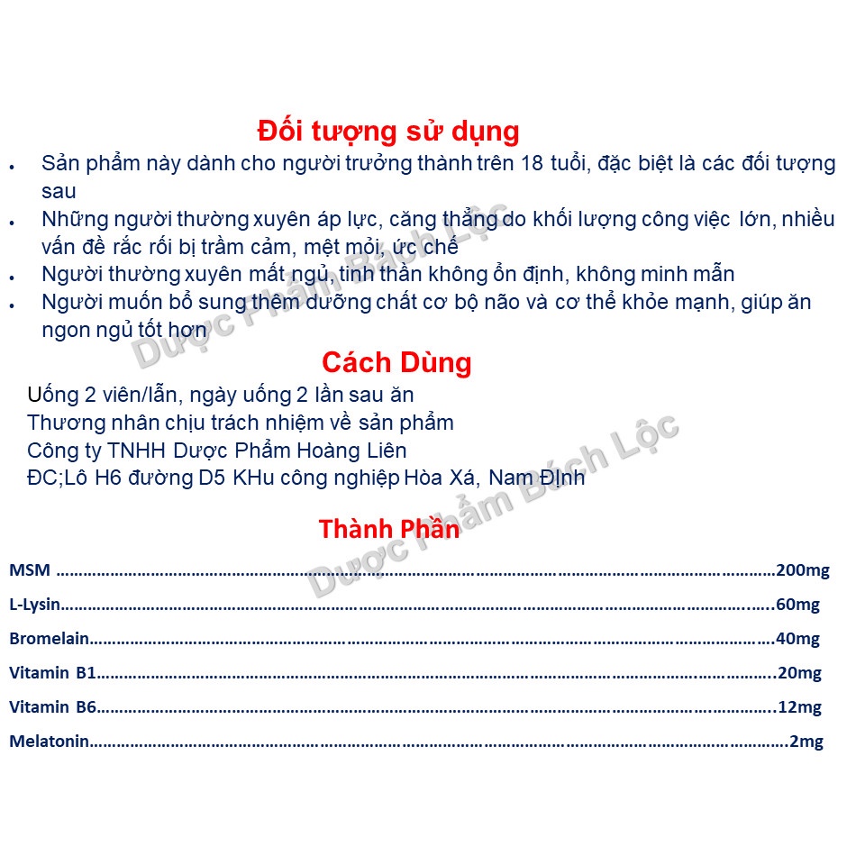 CÔNG DỤNG: Được sử dụng nhằm tăng cường trí nhớ, hỗ trợ làm giảm các triệu chứng rối loạn thần kinh cảm giác và cải thiện tình trạng thiếu máu lên não. Viên uống có thể khắc phục triệu chứng chóng mặt, đau đầu, giảm trí nhớ, mệt mỏi, uể oải, mất ngủ, ngủ không sâu giấc do tuần hoàn não kém, căng thẳng kéo dài. Ngoài ra, còn được sử dụng cho người bị thoái hóa thần kinh và mất thăng bằng do hội chứng rối loạn tiền đình. Có thể giải tỏa lo âu, căng thẳng, giảm đau nửa đầu vai gáy và tăng cường lưu lượng máu lên não. Bên cạnh đó, sản phẩm còn có tác dụng tăng cường trí nhớ, phòng ngừa và làm giảm các triệu chứng rối loạn tiền đình, tạo tâm lý thoải mái, thư thái và hỗ trợ cải thiện chất lượng giấc ngủ. Viên uống còn có tác dụng điều hòa nhịp sinh học, loại bỏ gốc tự và các yếu tố gây nhiễu loạn tâm trí, giấc ngủ.làm giảm các triệu chứng của stress, giúp cơ thể dễ dàng chìm vào giấc ngủ, ngủ sâu giấc và đem lại cảm giác khỏe mạnh, thư thái sau khi thức dậy. · Giúp dễ ngủ, ngủ ngon sau 2-3 tuần, khỏi 80% tình trạng mất ngủ sau 1-2 tháng và ngủ ngon trọn vẹn sau 3 tháng ĐỐI TƯỢNG SỬ DỤNG · Sản phẩm này dành cho người trưởng thành trên 18 tuổi, đặc biệt là các đối tượng sau · Những người thường xuyên áp lực, căng thẳng do khối lượng công việc lớn, nhiều vấn đề rắc rối bị trầm cảm, mệt mỏi, ức chế · Người thường xuyên mất ngủ, tinh thần không ổn định, không minh mẫn · Người muốn bổ sung thêm dưỡng chất cơ bộ não và cơ thể khỏe mạnh, giúp ăn ngon ngủ tốt hơn ⭐CHẤT LƯỢNG SẢN PHẨM ⭐ _ Sản phẩm là hàng chính hãng 100% , có đầy đủ hóa đơn chứng từ _ Quý khách có thể check mã vạch sản phẩm trên app, icheck 🙌SHOP XIN CAM KẾT VỚI QUÝ KHÁCH HÀNG 🙌 _Cam kết chất lượng và mẫu mã sản phẩm giống với hình ảnh. _ Đóng gói cẩn thận , giao hàng nhanh chóng. _ Tư vấn , hỗ trợ, nhiệt tình. _ Sản phẩm có bất kỳ vấn đề lỗi phát sinh nào sẽ đổi trả theo quy định shopee. Lưu ý: Sản phẩm này không phải là thuốc và không có tác dụng thay thế thuốc chữa bệnh