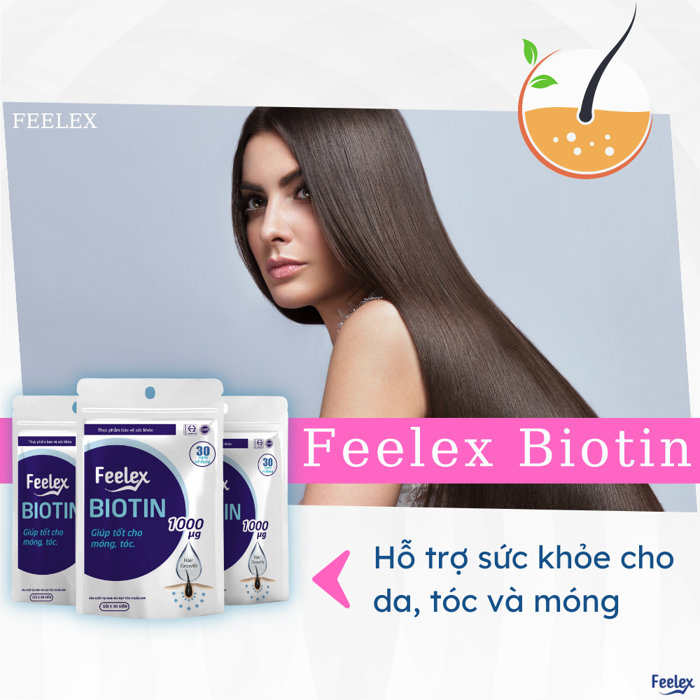 Viên uống Feelex Biotin ngăn rụng tóc, hỗ trợ mọc tóc gói 30 viên (30 Ngày) Thương hiệu: Feelex Xuất xứ: Việt Nam Thành phần: 1000mg biotin và 10g cao hà thủ ô Hạn sử dụng: 3 năm Quy cách: Gói 60 viên Điều kiện bảo quản: Nơi khô ráo thoáng mát NSX: Xem trên bao bì Feelex là một thương hiệu mới tại Việt Nam đang trên con đường phát triển với định hướng sản xuất các sản phẩm về sức khoẻ sinh lý. Với mục tiêu sản phẩm chất lượng tốt, giá thành phải chăng đem lại những trải nghiệm tốt nhất cho sức khoẻ người dân Việt Nam. Cùng với đó luôn luôn lắng nghe khách hàng để tạo sự đa dạng về chủng loại cũng như mức độ hoàn thiện sản phẩm hơn. Những sản phẩm nhà Feelex ra mắt đang được người tiêu dùng đón nhận, yêu mến và phản hồi rất tích cực . Là thương hiệu mới vẫn đang dần phát triển từng ngày, chúng tôi không ngừng cập nhật, cố gắng mang những sản phẩm chất lượng nhất đến tay quý khách hàng trong những thời gian sớm nhất. Viên uống biotin Feelex Biotin bổ sung hữu hiệu 1000μg biotin và 10g Cao hà thủ ô mỗi ngày cho mái tóc và làn da khỏe đẹp. Giới thiệu về viên uống Feelex biotin Biotin là một loại chất dinh dưỡng thiết yếu được phân loại vào nhóm vitamin B và còn được gọi là "vitamin H" hoặc "vitamin B7", đóng các vai trò khác nhau trong cơ thể như chuyển hóa đường, lipid và axit amin. Đặc biệt, biotin tham gia sâu vào việc duy trì sức khỏe làn da, niêm mạc, sự phát triển của móng tay và tóc. Nếu thiếu biotin thì cơ thể sẽ xuất hiện các triệu chứng về da như viêm da dị ứng và rụng tóc. Công dụng của viên uống Feelex Biotin ngăn rụng tóc Biotin được biết đến như một loại vitamin làm đẹp có liên quan sâu sắc đến sức khỏe của da và niêm mạc. Viên uống Feelex Biotin bổ sung hữu hiệu hàm lượng biotin để tham gia vào quá trình tổng hợp keratin - loại protein cơ bản tạo nên cấu trúc tóc. Bổ sung viên uống Feelex Biotin mỗi ngày giúp bạn có mái tóc chắc khỏe, hạn chế được tình trạng gãy rụng và có thể giúp mọc tóc. Công dụng viên uống Feelex Biotin Hỗ trợ mọc tóc Ngăn rụng tóc do dị ứng, viêm da cơ địa Làm đẹp da Tăng cường thể lực Ưu điểm của viên Feelex Biotin Viên uống Feelex Biotin là viên nén giải phóng có kiểm soát. Biotin thông thường tan trong nước nên nó sẽ nhanh chóng được đào thải ra khỏi cơ thể sau khi uống. Tuy nhiên, viên nén của Feelex sẽ giải phóng biotin từ từ trong suốt thời gian đi vào cơ thể nhằm kéo dài tác dụng của dưỡng chất. Thành phần viên uống Feelex Biotin Mỗi viên nén có chứa: + 10mg cao hà thủ ô đỏ + 1000mcg biotin (vitamin B7) + 1 số phụ liệu khác Đối tượng sử dụng: + Người muốn duy trì sức khỏe của tóc và da + Người muốn bổ sung hàm lượng biotin hiệu quả + Người không thể dùng bổ sung biotin thường xuyên qua bữa ăn hằng ngày + Người muốn nâng cao sức khỏe Cách dùng: + Mỗi ngày uống 1 viên Bạn có thể uống viên Feelex biotin vào bất cứ lúc nào trong ngày. Tuy nhiên, thời điểm tốt nhất để uống viên Feelex biotin đó là nên uống sau khi ăn tối để thu được hiệu quả cao hơn. Lưu ý: Thực phẩm này không phải là thuốc, không có tác dụng thay thế thuốc chữa bệnh. Sản phẩm không dùng cho người mẫn cảm, kiêng kị với các thành phần của sản phẩm. Dừng uống khi phát hiện bất thường. Không sử dụng sản phẩm nếu dị ứng với bất cứ thành phần nào của sản phẩm. Tham khảo ý kiến bác sĩ trước khi dùng nếu bạn đang dùng thuốc khác hoặc đang mang thai. Để xa tầm tay trẻ em. Đóng mở túi cẩn thận, nên uống nhanh sau khi mở. Bảo quản: Nơi khô ráo, thoáng mát, tránh ánh sáng trực tiếp. Giá sản phẩm trên Tiki đã bao gồm thuế theo luật hiện hành. Bên cạnh đó, tuỳ vào loại sản phẩm, hình thức và địa chỉ giao hàng mà có thể phát sinh thêm chi phí khác như phí vận chuyển, phụ phí hàng cồng kềnh, thuế nhập khẩu (đối với đơn hàng giao từ nước ngoài có giá trị trên 1 triệu đồng).....