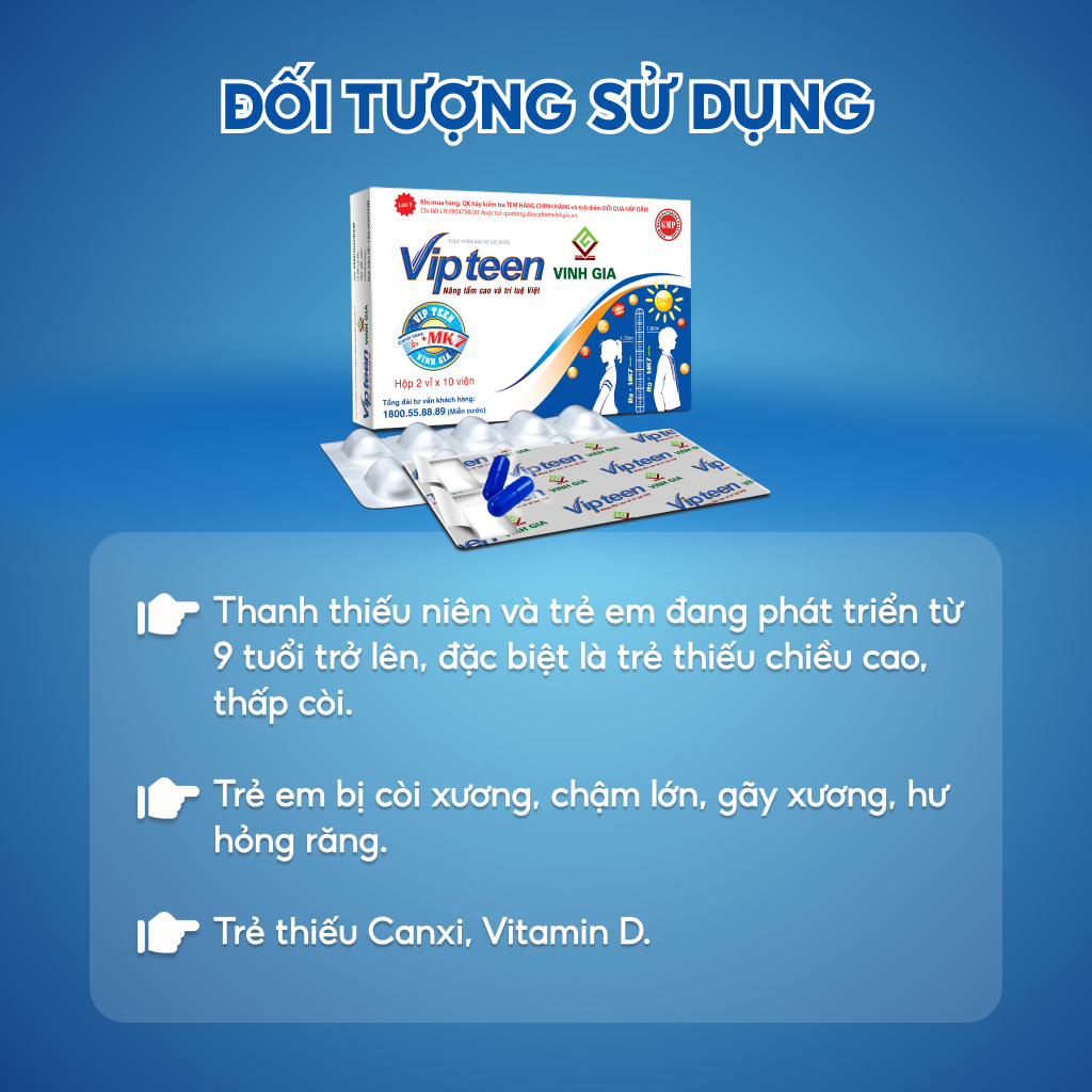 Viên Uống Hỗ Trợ Phát Triển Chiều Cao VIPTEEN VINH GIA Cho Trẻ Từ 9-18 Tuổi Hộp 20 Viên 1. THÔNG TIN SẢN PHẨM- Tên sản phẩm: Viên Uống Hỗ Trợ Phát Triển Chiều Cao VIPTEEN VINH GIA- Thương hiệu: VINH GIA- Xuất xứ: Việt Nam- Quy cách hộp: 20 viên- Hạn sử dụng: 24 tháng- Viên uống hỗ trợ phát triển chiều cao cho trẻ từ 9 tuổi và thanh thiếu niên giúp bổ sung canxi, vitamin D cải thiện chiều cao và xương chắc khỏe. 2. THÀNH PHẦN- Menaquinon-7 (MK7), Vitamin D3, Calci Carbonat (dạng nano), Magnesium Oxide, Zinc Oxide nano (Kẽm oxyd dạng nano), Chelate Boron amino acid, Manganese gluconate, Copper Gluconate (Đồng gluconate), Natri chondroitin sulphate, Horsetail Extract (Equisetum Arvense) ( chiết xuất cỏ đuôi ngựa), DHA, Acid Folic, Vitamin B1, Vitamin B6.- Thành phần khác: lactose monohydrat, PVP K30, magnesi stearat, ethanol 96% 3. CÔNG DỤNG- Viên uống giúp bổ sung canxi, vitamin D, MK7 (vitamin K2), hỗ trợ xương răng chắc khỏe.- Hỗ trợ giúp phát triển chiều cao và hỗ trợ hạn chế nguy cơ còi xương, thấp còi. 4. CÁCH DÙNG- Uống mỗi lần 2 viên, ngày 2 lần (sáng/ chiều). - Nên uống trước bữa ăn 30 phút hoặc sau khi ăn 1 giờ. - Nên sử dụng thành từng đợt từ 3-6 tháng để có kết quả tốt. - Có thể sử dụng hàng ngày và thường xuyên để thu được kết quả tốt - Để đạt kết quả tốt, cần kết hợp với việc ăn uống đủ dưỡng chất, sinh hoạt điều độ, tập thể dục đều đặn và ngủ đủ giấc. 5. ĐỐI TƯỢNG SỬ DỤNG+ Thanh thiếu niên và trẻ em từ 9 tuổi trở lên, trẻ em đang trong giai đoạn phát triển.+ Trẻ còi xương, thiếu Canxi, vitamin D.#vipteen#vipteenvinhgia#vienuong#vienuongphattrienchieucao#vienuongphattrienchieucaochotre#vienuongphattrienchieucaochotretu9tuoi#vGiá sản phẩm trên Tiki đã bao gồm thuế theo luật hiện hành. Bên cạnh đó, tuỳ vào loại sản phẩm, hình thức và địa chỉ giao hàng mà có thể phát sinh thêm chi phí khác như phí vận chuyển, phụ phí hàng cồng kềnh, thuế nhập khẩu (đối với đơn hàng giao từ nước ngoài có giá trị trên 1 triệu đồng).....