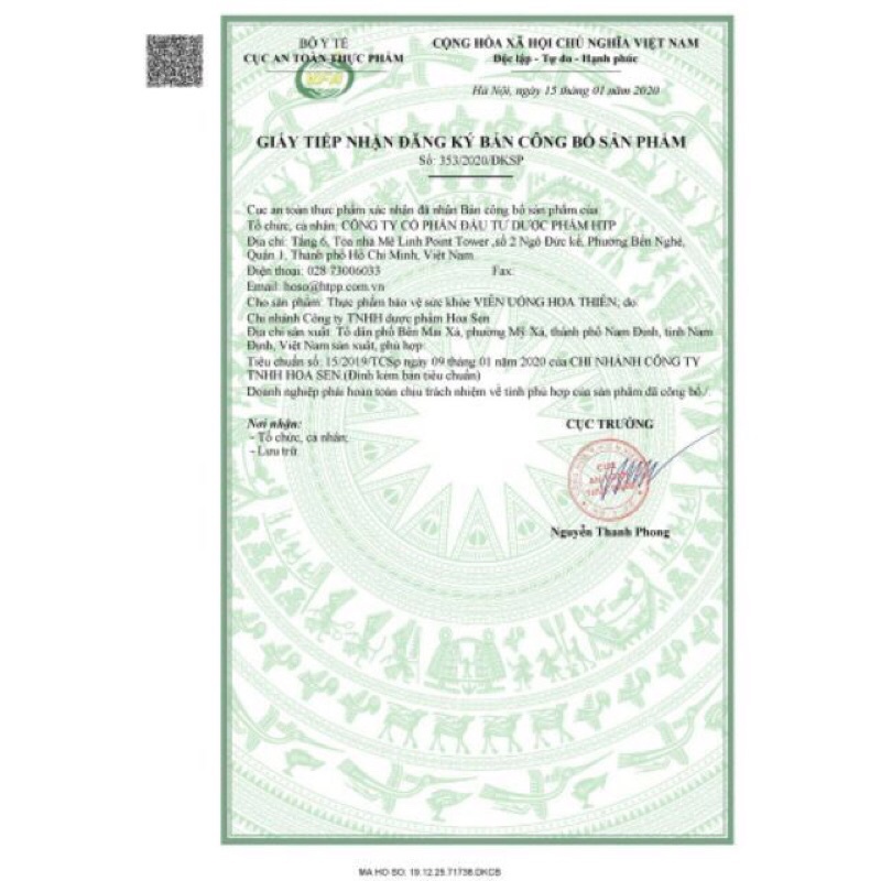 Dựa trên sự phối hợp từ tinh hoa Y học cổ truyền, với các vị dược liệu quý như Quy râu, Ngưu tất, Thục địa, Ích mẫu, Collagen, Vitamin A, Vitamin C... đặc biệt với Tinh chất mầm đậu tương Isoflavon – Estrogen thảo dược đến 80% Đả tạo nên một siêu phẩm về cân bằng nội tiết tố kết hợp với làm trắng sáng da một cách tự nhiên cho chị em phụ nữ Công dụng: Bổ sung nguồn estrogen thực vật giúp cân bằng nội tiết tố nữ, tăng cường sinh lý nữ, giảm các triệu chứng thời kỳ tiền mãn kinh. Giúp bổ máu, tăng cường lưu thông máu để khắc phục tình trạng khó ngủ, mất ngủ ở phụ nữ. Bổ sung collagen và các dưỡng chất cần thiết giúp hạn chế lão hóa da, khắc phục tình trạng da nhăn, khô, sạm để làn da được đàn hồi, căng mịn và trắng sáng. Mỗi một viên uống bao gồm các thành phần chính như sau: Tinh chất mầm đậu tương: 250mg Vitamin C: 30mg Lô hội: 30mg Ngưu tất: 70mg Quy râu: 70mg Ích mẫu: 70mg Vitamin E: 12UI Omega 3 và 6: 10mg L – Cystine: 200mg Thục địa: 70mg Collagen: 100mg Dầu gấc: 50mg Trong đó, mỗi thành phần đều có tác dụng riêng như: Tinh chất mầm đậu nành: Chứa nhiều vitamin E và hoạt chất isoflavones có tác dụng hỗ trợ cân bằng nội tiết tố. Đồng thời giúp hỗ trợ cải thiện tình trạng mất ngủ, đau nhức xương khớp hoặc chứng đổ mồ hôi nhiều hay gặp ở phụ nữ đang trong giai đoạn tiền mãn kinh hoặc mãn kinh. Bên cạnh đó, các hoạt chất này còn có công dụng làm chậm quá trình lão hóa da, giúp da căng mịn và tràn đầy sức sống L – Cystine: Đây được xem là chất chống oxy hóa có tác dụng cải thiện các khuyết điểm trên da như vết nám, thâm hoặc tàn nhàng, đồi môi ở phụ nữ bước sang độ tuổi băm Dầu gấc: Chứa lượng lớn hoạt chất beta – caroten rất tốt đối với mắt. Nếu thường xuyên sử dụng, chúng giúp làm cải thiện tình trạng khô mắt, đồng thời hỗ trợ điều trị quáng gà và làm sáng mắt. Chưa kể đến, các thành phần dưỡng chất có trong dầu gấc còn giúp ngăn ngừa quá trình lão hóa da, giúp da trở nên mềm mịn hơn Ích mẫu, ngưu tất, quy râu và thục địa: Có tác dụng hỗ trợ điều hòa kinh nguyệt, đồng thời giúp máu lưu thông tốt. Từ đó giúp da trở nên sáng mịn, tinh thần thoải máu, ngủ sâu và ăn ngon miệng hơn Collagen: Chống lão hóa và giúp giảm vết nhăn Lô hội: Có tác dụng làm cân bằng độ pH trên da, hạn chế tình trạng khô da Vitamin A và E: Giúp ngăn chặn sự tấn công của các gốc tự do gây hại cho da Đối tượng dùng viên uống Hoa Thiên - Phụ nữ bị suy giảm sinh lý với các triệu chứng: suy giảm sinh lý, bốc hỏa, đau đầu, chóng mặt, mất ngủ. - Phụ nữ muốn cải thiện tình trạng da bị lão hóa, da thiếu sức sống, da khô, da sạm hoặc phụ nữ muốn dưỡng da, ngăn ngừa lão hóa, duy trì làn da đẹp từ bên trong. Hướng dẫn sử dụng viên uống Hoa Thiên - Ngày uống 2 lần, mỗi lần 2 viên. Uống trước khi ăn 30 phút hoặc sau khi ăn 60 phút. SẢN PHẨM NÀY KHÔNG PHẢI LÀ THUỐC VÀ KHÔNG CÓ TÁC DỤNG THAY THẾ THUỐC CHỮA BỆNH