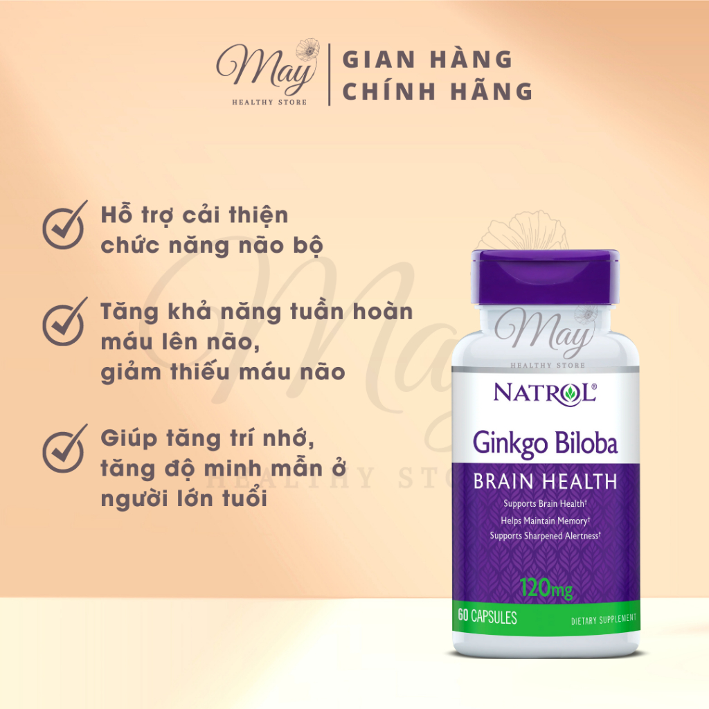 Ginkgo Biloba (Lá Bạch Quả) từ lâu đã được tin dùng nhờ công dụng bổ trợ não bộ, trí nhớ tuyệt vời của nó. Viên Uống Natrol Ginkgo Biloba Brain Health 120mg từ Natrol mang đến công dụng: - Hỗ trợ cải thiện chức năng não bộ. - Tăng khả năng tuần hoàn máu lên não, giảm nguy cơ thiếu máu não. - Giúp tăng trí nhớ, tăng độ minh mẫn ở người lớn tuổi. __________________________________ Thông tin sản phẩm: - Tên: Natrol Ginkgo Biloba Brain Health 120mg - Thành phần: Ginkgo Biloba Extract 120mg - Xuất xứ thương hiệu: Mỹ - Quy cách đóng gói: Lọ 60 viên - Ngày sản xuất: 10/2022 - Hạn sử dụng (Exp): 10/2026 ______________________________________ Hướng dẫn sử dụng: - Ngày uống 1 lần mỗi lần 1 viên. - Uống cùng bữa ăn. ______________________________________ Thận trọng: - Không dùng cho người mẫn cảm bất cứ thành phần nào của sản phẩm - Không dùng cho trẻ em dưới 18 tuổi - Người đang mắc bệnh lý cần tham khảo ý kiến chuyên gia trước khi dùng - Ngưng sử dụng và tham khảo tư vấn của chuyên gia y tế nếu xuất hiện bất cứ biểu hiện bất thường nào trong quá trình sử dụng sản phẩm ______________________________________ Thông tin dị ứng: - Không dùng cho người mẫn cảm bất cứ thành phần nào của sản phẩm. - Chưa có ghi nhận trường hợp dị ứng nghiêm trọng. ______________________________________ Hướng dẫn bảo quản: - Bảo quản nơi khô ráo, tránh ánh sáng mặt trời - Để xa tầm tay trẻ em ______________________________________ *Lưu ý: Sản phẩm không phải là thuốc, không có tác dụng thay thế thuốc chữa bệnh