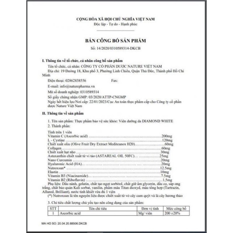 DIAMOND WHITE DAY & NIGHT – Là sản phẩm viên uống dưỡng trắng da cao cấp, tiếp nối thành công của viên uống trắng da Beauty DW đình đám, với nhiều công dụng vượt trội trong việc dưỡng trắng da hiệu quả từ bên trong, giúp bảo vệ da toàn diện, chống lão hóa, đẩy lùi sạm nám và tàn nhang. Làm da sáng đẹp và mịn màng chỉ trong thời gian ngắn. Được xem là viên uống trắng da hot nhất 2020. ✅ Hỗ trợ tăng cường khả năng chống Oxy hóa ✅ Làm chậm quá trình lão hóa, xóa mờ nếp nhăn ✅ Dưỡng da từ bên trong, giúp da trắng sáng, mềm mịn ✅ Bảo vệ làn da, chống tia UV và tác hại của môi trường ô nhiễm ✅ Chống khô da, tăng cường độ mịn và độ đàn hồi cho da ✅ Hiệu quả dưỡng trắng da gấp 2 lần Thành phần đầy đủ: Vitamin C (Ascorbic acid): 200mg; L-Cystine: 120mg; Chiết xuất Oliu: 60mg; Collagen: 60mg; Chiết xuất hạt nho: 30mg; Astaxanthin chiết xuất từ vi tảo: 25mg; Nano Curcumin: 20mg; Hyaluronic Acid (HA): 20mg; Nutroxsun*: 12.5mg; Elastin: 10mg; Vitamin B3: 7.5mg; Vitamin B2: 1.5mg. Ngoài ra, còn có phiếu bảo hành da của Diamond White trị giá 100 triệu đồng, nếu phát hiện các chất gây hại có trong thành phần của sản phẩm. Cách sử dụng Diamond White cũng rất đơn giản: Liều dùng: ngày uống 2 viên, buổi sáng 1 viên, buổi tối 1 viên, uống sau khi ăn Liệu trình: Bạn nên sử dụng đầy đủ liệu trình, liên tục từ 2-3 tháng để cho kết quả tốt nhất Sản phẩm không phải là thuốc và không có tác dụng thay thế thuốc chữa bệnh #vienuongtrangda,#beauty_diamond_white #shopee,#freeship,#flashsale