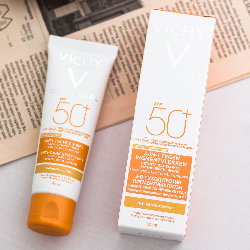 Kem Chống Nắng Vichy Ideal Soleil SPF50+ UVB+UVA Anti Dark Spots 3 in 1 áp dụng công nghệ tiên tiến với 3 màng lọc, giúp chống nắng, ngăn lão hóa, ngừa ung thư và bảo vệ da tối ưu nhất trước các tia cực tím (UVA, UVB). Loại da phù hợp: Phù hợp mọi loại da. Đặc biệt là da nhạy cảm. Công dụng: - Công nghệ màng lọc Mexoryl độc quyền giúp bảo vệ da tối ưu trước tia UVA và UVB, ngăn ngừa sạm nám, lão hoá sớm và ung thư da. - Màng lọc SX (bảo vệ trước tia UVA ngắn + UVA dài sản sinh ra đốm nâu, vết nhăn, lão hóa da dẫn đến ung thư da). - Màng lọc XL bảo vệ da trước các tác nhân của tia UVB gây bỏng rát da. - Màng lọc Octocrylene giúp bảo vệ da trước tai hại của tia UVA + UV. - Phe-Resorcinol - Vitamin E có khả năng ức chế tổng hợp Melanin, từ đó giúp cải thiện các vết thâm nám, làm đều màu da. Nước khoáng núi lửa Vichy giàu khoáng chất giúp củng cố và nuôi dưỡng hàng rào bảo vệ da trước các tác nhân bên ngoài. - Alkyl Benzoate giúp da khô thoáng sau khi thoa, không gây nhờn rít, không để lại vệt, không làm bít tắc lỗ chân lông. - Aluminium Starch Octenylsuccinate giúp giảm bóng dầu. - Dạng kem có màu giúp che phủ khuyết điểm. - Khả năng chống nước tốt, lâu trôi khi bạn tiếp xúc với nước hay mồ hôi. Thành phần: Aqua / Water, Ci 77891 / Titanium Dioxide, Homosalate, Silica, Ethylhexyl Salicylate, Ethylhexyl Triazone, C12-15 Alkyl Benzoate, Bis-Ethylhexyloxyphenol Methoxyphenyl Triazine, Drometrizole Trisiloxane, Butyl Methoxydibenzoylmethane, Glycerin, Aluminum Starch Octenylsuccinate, Octocrylene,... Hướng dẫn sử dụng: - Lấy 1 lượng kem vừa đủ thoa lên toàn bộ khuôn mặt và vỗ nhẹ để kem thấm vào da. - Đừng quên thoa phần da cổ, gáy, sau tai... để bảo vệ da toàn diện. - Thoa kem trước khi ra đường 15 phút để kem chống nắng phát huy hiệu quả. - Thoa lại sau 4 tiếng hoạt động ngoài trời để bảo vệ da tối ưu. - Tẩy trang khi về nhà với sản phẩm chuyên dụng. Thông tin chung: - Thương hiệu: Vichy - Xuất xứ: Pháp - Hạn sử dụng: 3 năm kể từ ngày sản xuất. NSX được in trên bao bì sản phẩm.