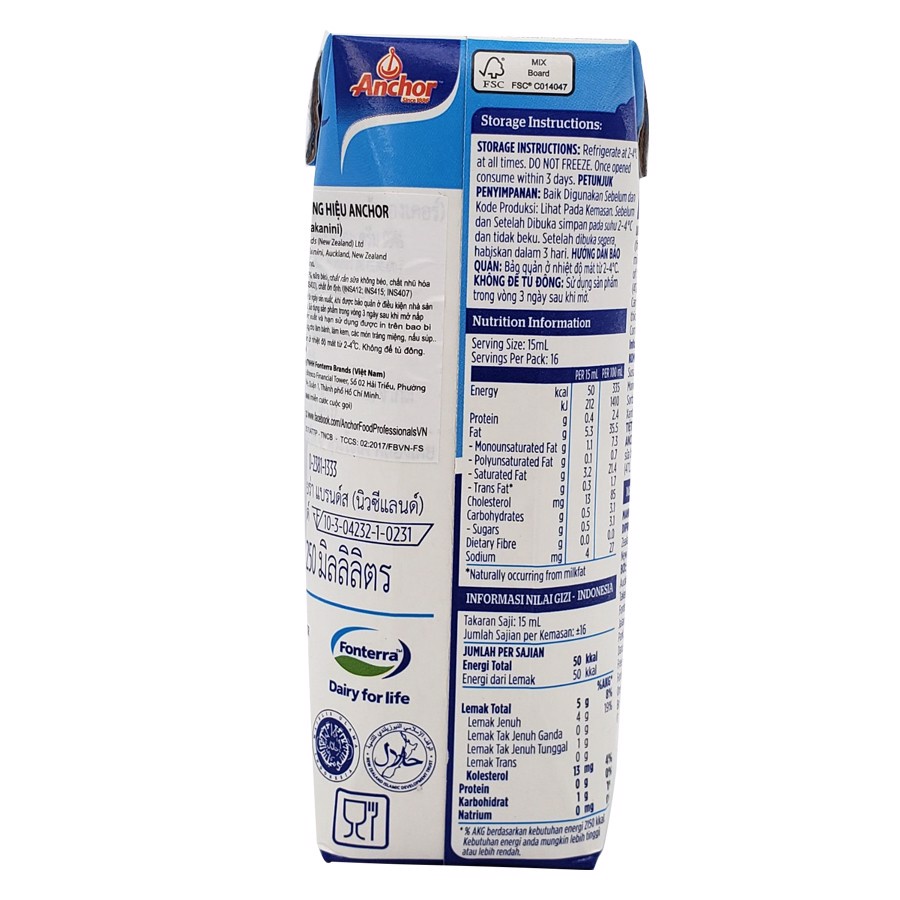 Kem tươi whipping cream Anchor là loại kem tươi có nguồn gốc từ sữa động vật, có xuất xứ New Zealand. Kem tươi whipping cream Anchor có chứa thành phần chất béo tới 35,5% nên kem đảm bảo độ thơm ngậy của sữa. Sản phẩm không chứa đường (do được tách ra từ sữa bò tươi n
