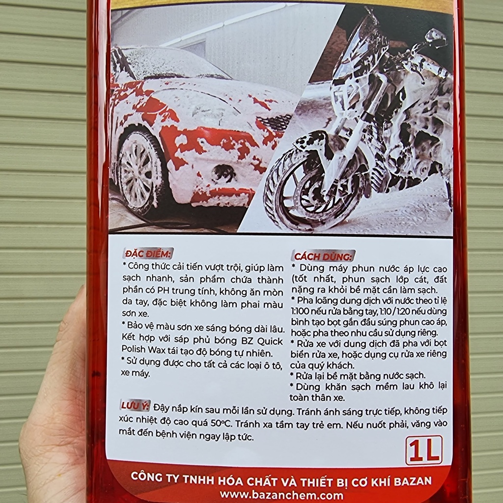 Xà Bông rửa xe bóng loáng đậm đặc của bz đã có mặt tại nhà. - Đặc điểm làm sạch tất cả các bề mặt sơn, Cao su ,Nhựa ,Thuỷ tinh, Và bề mặt tráng men hay các chi tiết máy móc - An toàn vs da tay, - Hương thơm dịu nhẹ - Không chứa chất ăn mòn như nước rửa chén thông thường - Tạo lớp bóng trên bè mặt sau khi rửa Cách sử dụng : 1. Đô Bz ra năp pha trực tiếp với tỉ lệ 1 nắp xà bông BZ + 1 Lít nước theo tỷ lệ (1:100) hoặc xài trực tiếp với máy rửa xe để tạo bọt tối đa 2. Đánh đều hỗn hợp vừa pha 3. Dùng khăn, bao tay lau trựa tiếp lên bề mặt cần rửa 4. Rửa lại với nước sạch Quy các đóng gói: - Dùng cho tất cả các dòng xe oto và xe máy . - Thùng 12 chai , 1 chai 1 Lít - Hiệu quả hơn khi dùng kèm, bao tay hoặc cọ rửa xe