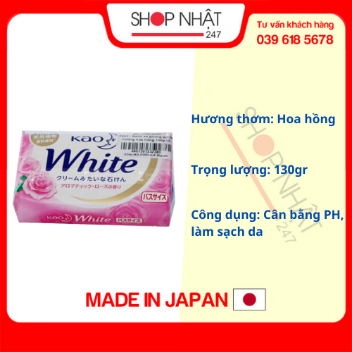 Với nguyên liệu 100% từ thảo mộc thiên nhiên giúp làm sạch sâu tận lỗ chân lông trên da và cung cấp dưỡng chất tự nhiên từ dừa, dầu dừa, dầu trái cọ… Cho da mang lại làn da sạch láng và mịn màng. Xà bông Kao có độ PH rất thấp, điều này có thể giúp duy trì sự cân bằng PH cho da. Tránh các bệnh về da, vì thế có lợi cho da, kể cả da dễ kích ứng. Xà bông Kao White được sản xuất đảm bảo chất lượng quy trình tạo thành phẩm trong vòng 14 tiếng, trải qua 7 lần sàng lọc tạp chất tự nhiên. Xà bông tạo bọt cực thích, giúp tẩy rửa. Làm sạch mà không hề tổn hại tới da. Hương hoa hồng mát, giúp thư giãn, tỉnh táo hơn Thành phần: cọ axit béo hạt nhân Na. Palm axit béo Na, nước, axit hạt cọ béo, axit cọ béo, glycerin, nước hoa, squalane, gluconate Na, etidronate, clorua Na, titan oxit, axit pentetic 5Na. PEG-6. BHTTrọng lượng: 130g Giá sản phẩm trên Tiki đã bao gồm thuế theo luật hiện hành. Bên cạnh đó, tuỳ vào loại sản phẩm, hình thức và địa chỉ giao hàng mà có thể phát sinh thêm chi phí khác như phí vận chuyển, phụ phí hàng cồng kềnh, thuế nhập khẩu (đối với đơn hàng giao từ nước ngoài có giá trị trên 1 triệu đồng).....