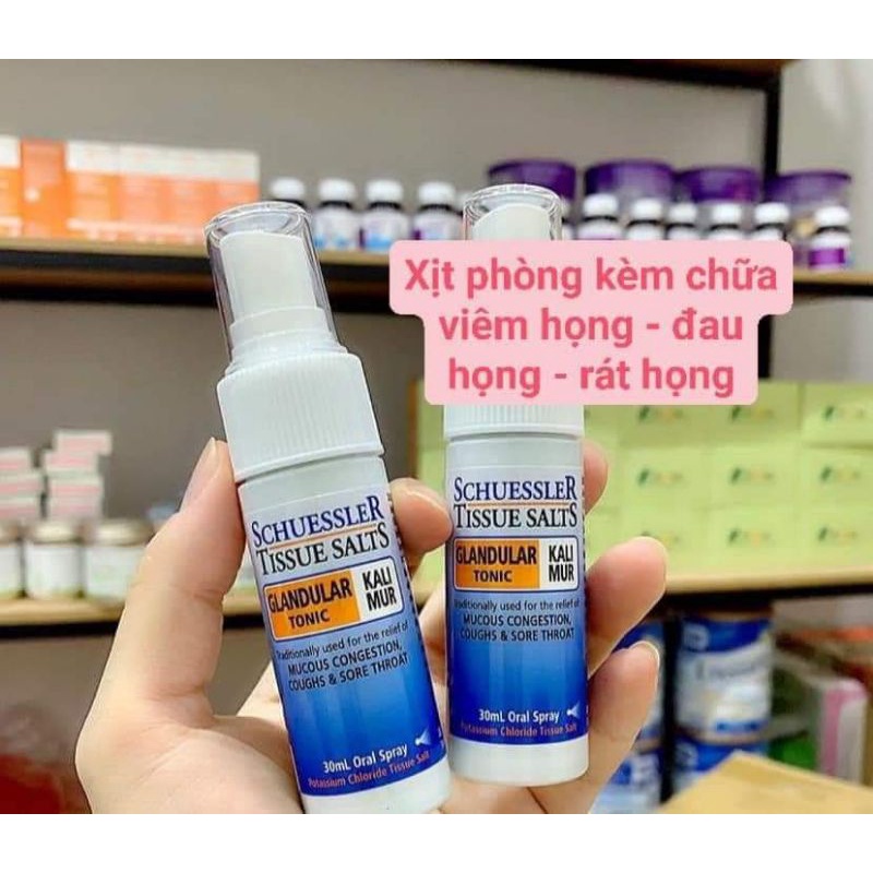 Schuessler Kali Mur xịt họng và viên uống sản phẩm tuyệt vời cho bé và gia đình trong mùa đông. Được dùng trong các trường hợp: - Sổ, ngạt mũi. Các vấn đề về họng trong mùa đông.... Kali Mur là biện pháp khắc phục tình trạng uể oải và điều chỉnh sự cân bằng của chất lỏng trong cơ thể và giúp các dây thần kinh và cơ hoạt động bình thường. Muối mô này ảnh hưởng đến sự trao đổi chất của đường và protein và rất quan trọng trong việc duy trì hoạt động cân bằng của ruột. HDSD: 👉 Dạng xịt - Người lớn: 4 xịt - Trẻ từ (1-11 tuổi): 2 xịt - Trẻ tơ sinh (0-11 tháng): 1 xịt Với trẻ sơ sinh có thể xịt cùng 1 chút nước Duy trì 4 lần/ngày Liều cấp: 30 phút xịt 1 lần cho đủ 4 lần. Sau đó duy trì 1 xịt/lần (tối đa 8 lần) trong ngày 👉 Dạng viên - Người lớn: 1v - Trẻ từ (1-11 tuổi): 1/2 viên - Trẻ sơ sinh (0-11 tháng): 1/4 viên Trẻ dưới 2 tuổi nghiền nát và hòa với chút nước cho bé dùng. Duy trì 4 lần/ngày Liều cấp: 30 phút dùng 1 viên (tối đa 6 viên/ngày) Lưu ý: Sản phẩm này không phải là thuốc và không có tác dụng thay thế thuốc chữa bệnh