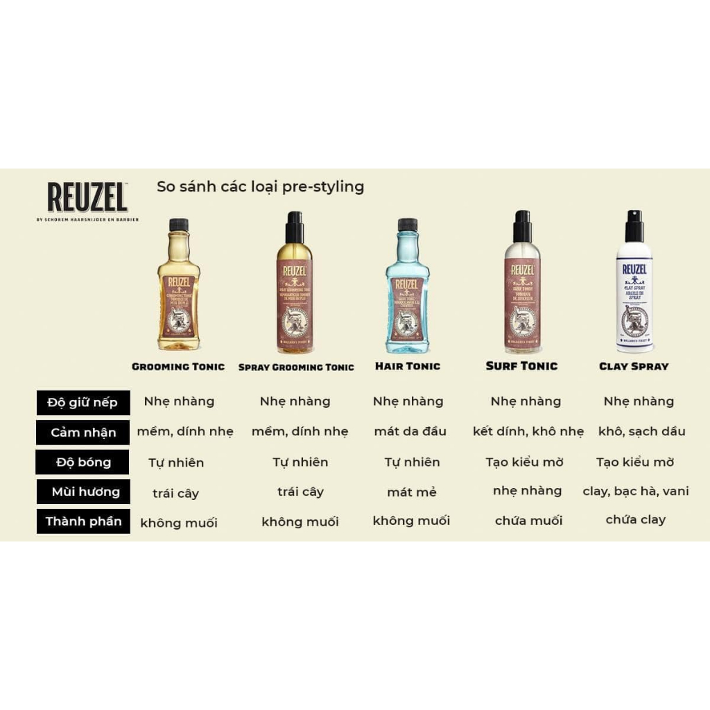 ***Lưu ý: Đây không phải sản phẩm thuần dưỡng. - Tất cả đều là sản phẩm hỗ trợ tạo kiểu có công dụng: + Tăng độ phồng, độ giữ nếp, kết dính. + Bảo vệ nhiệt từ máy sấy. - Chai ẩm sẽ phù hợp dùng với tóc khô. - Chai khô dùng cho tóc dầu. - Chai nắp xịt sẽ nhanh và tiện hơn khi sử dụng. - Chai nắp đổ sẽ giúp sản phẩm bám đều hơn • Dung tích: 20ml - 50ml - 100ml • Xuất xứ: Hà Lan, Mỹ • Thương hiệu: Reuzel ---------------------------------- REUZEL GROOMING TONIC - Cung cấp độ ẨM Tăng cường hiệu năng - độ giữ nếp cả ngày mà vẫn cho mái tóc đẹp, một vẻ ngoài tự nhiên. Nó cho một lớp bao bọc hoàn hảo để tăng độ giữ nếp và kết cấu và nó sẽ giúp bảo vệ tóc khỏi sức nóng của sấy khô. LIGHT HOLD – LOW SHINE – WATER BASED • Thêm độ ẩm mà không làm nặng tóc • Axit béo omega 9 để bảo vệ tóc khỏi nhiệt • Hỗ trợ tạo kiểu, tăng độ giữ nếp, kết dính, độ phồng. • Tạo độ bóng tự nhiên giúp tóc có sức sống hơn. • Có thể kết hợp với Wax hoặc Pomade • Mùi Hương: Táo bạc hà ------------------------------------ REUZEL SURF TONIC - Cấp KHÔ: LIGHT HOLD – MATTE FINISH – ADDS TEXTURE • Thấm hút mồ hôi nhẹ: • Tăng độ giữ nếp, độ phồng tự nhiên. • Phóng đại kết cấu tự nhiên. • Cung cấp độ khô tự nhiên. • Không làm nặng tóc, mang lại độ bóng mờ giúp tóc có thêm sức sống. • Có thể sử dụng trên tóc khô hoặc tóc ẩm vừa dùng khăn khô. • Có thể kết hợp với Wax hoặc Pomade • Mùi hương: Không mùi ------------------------------------ CLAY TONIC - Cung cấp độ KHÔ Light Hold / No Shine • Thấm hút mồ hôi. • Giúp kiểm soát tóc xoăn • Tăng độ phồng, kết cấu. • Hoạt động tốt trên mọi loại tóc • Công thức thuần chay • Độ giữ nếp: Nhẹ • Độ bóng: Không bóng • Mùi hương: Không mùi ----------------------------------- HAIR TONIC - Cung cấp độ ẨM: LIGHT HOLD – LOW SHINE – OIL-FREE • Làm mát da, dưỡng nhẹ. • Có thể pha loãng với nước, làm ướt tóc trước khi cắt. • Công thức không chứa dầu sẽ không làm rụng tóc • Có thể được sử dụng như một loại kem dưỡng da cắt trên tóc ướt • Hương thơm tiệm hớt tóc hoài cổ • Công thức thuần chay • Mùi hương: Nostalgic Barbershop ----------------------------------- HƯỚNG DẪN SỬ DỤNG • Có 2 cách sử dụng: - Dùng lên tóc khô: Sử dụng trực tiếp lên tóc khô sau đó sấy và dùng sáp. Có thể để tự khô nếu muốn có kiểu tóc bóng bẩy và mềm mại. - Dùng lên Tóc ẩm - Prestyling: Sau khi đã gội sạch tóc, lau qua với khăn khô, dùng một lượng vừa phải. Bước tiếp theo là sấy tạo form và dùng Sáp/pomade. • Loại nắp: - Dạng xịt: Xịt đều 3 - 5 lần, dùng chải lược để sản phẩm có thể bám đều hơn. - Dạng đổ: Lấy 3 - 4 lần đổ tùy lượng tóc, xoa đều lòng