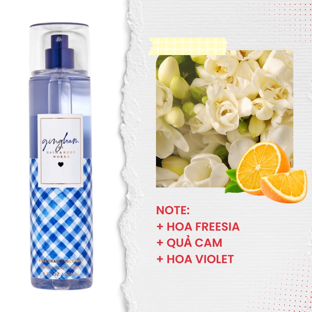 Xịt Thơm Body Bath And Body Works Gingham Khử Mùi Lưu Hương Thanh Mát Mùi Cỏ Hoa Thanh Khiết Dịu Dàng Chai 236ml Là sự kết hợp hoàn hảo giữa hương hoa lan Nam Phi pha lẫn chút cam quýt thanh mát, xịt thơm body Bath And Body Works Gingham mang lại cảm giác tư