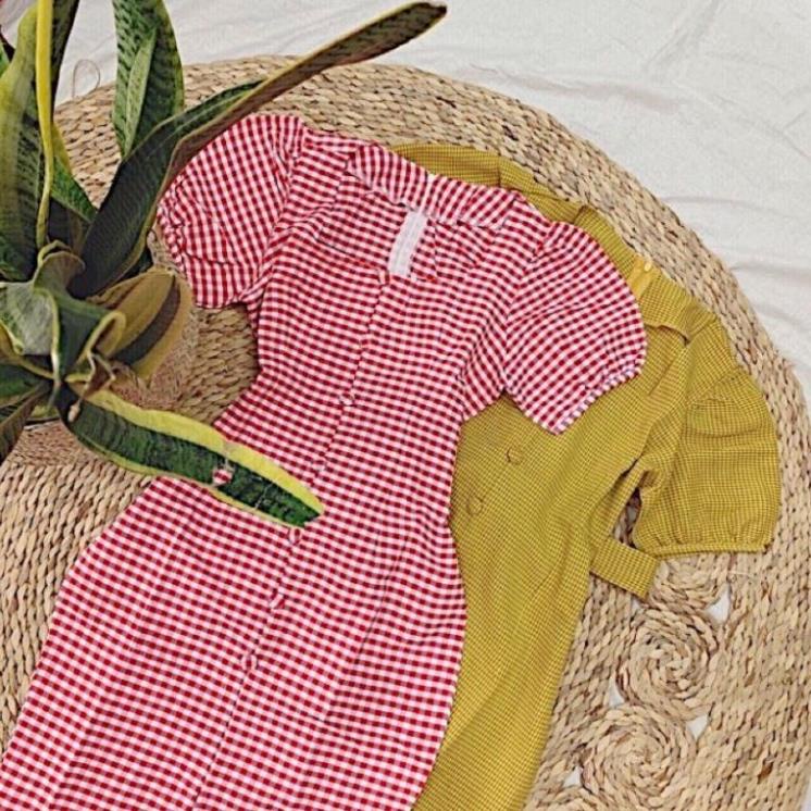 X2 váy caro cổ vuông cột nơ thắt eo sau lưng Đầm công sở xẻ tà đính nút bọc vàng hồng thanh lịch hàng thiết kế