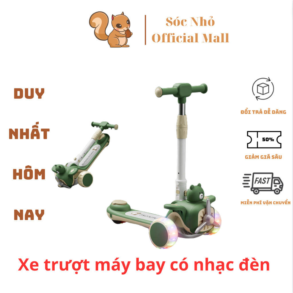 Xe trượt scooter máy bay gấu cho bé 3in1 - Xe trượt scooter gấp gọn bánh phát sáng có ghế ngồi có nhạc đèn